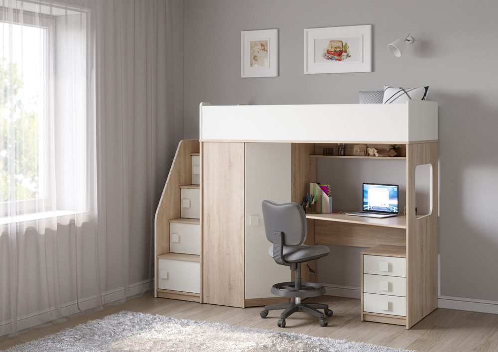 Учебная зона со столом под спальным местом открывает возможности для письменных работ, а также здесь удобно расположить ноутбук. Тумба Л-04 обеспечит хранеие канцелярских принадлежностей и учебников.